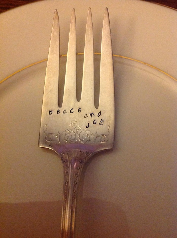 Perfect for the hostess with the mostess, "Peace and Joy" handstamped on silver plated upcycled serving fork.