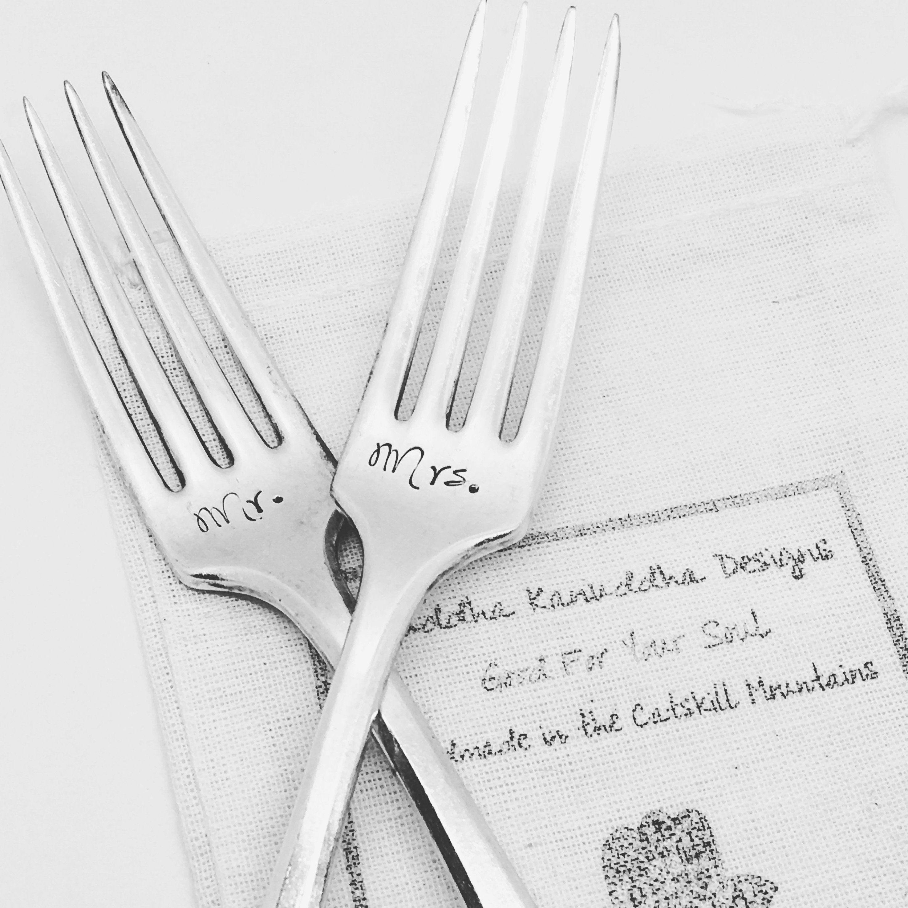 Perfect for that special couple on their wedding day. Beautiful silver plate cake forks with "Mr. " and "Mrs." hand stamped.