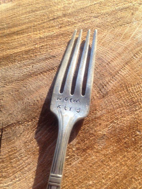 "Worm Xing" Hand Stamped on upcycled silverplated flatware. Will look adorable in your garden , and make the worms feel welcome.
