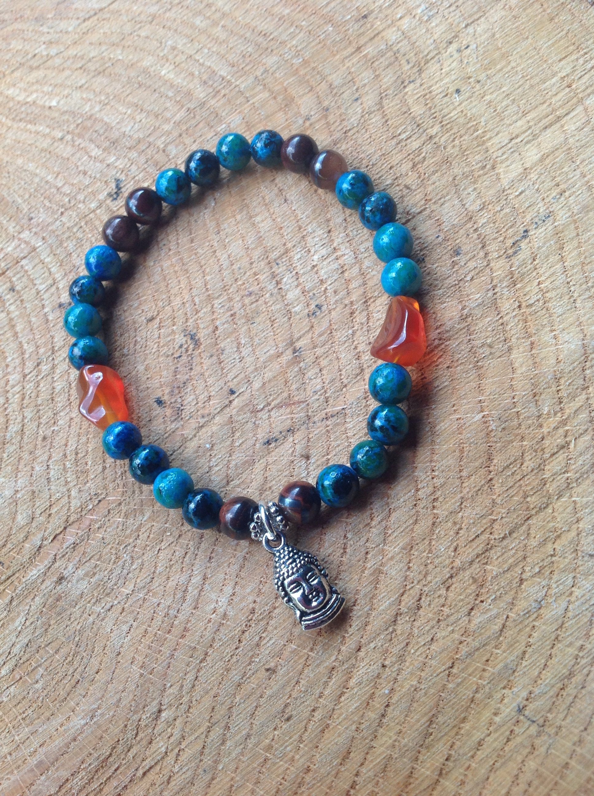Beautifully beaded green Jasper , red tiger eye, and Amber with Buddha charm. One size. Perfect alone or stack them up!