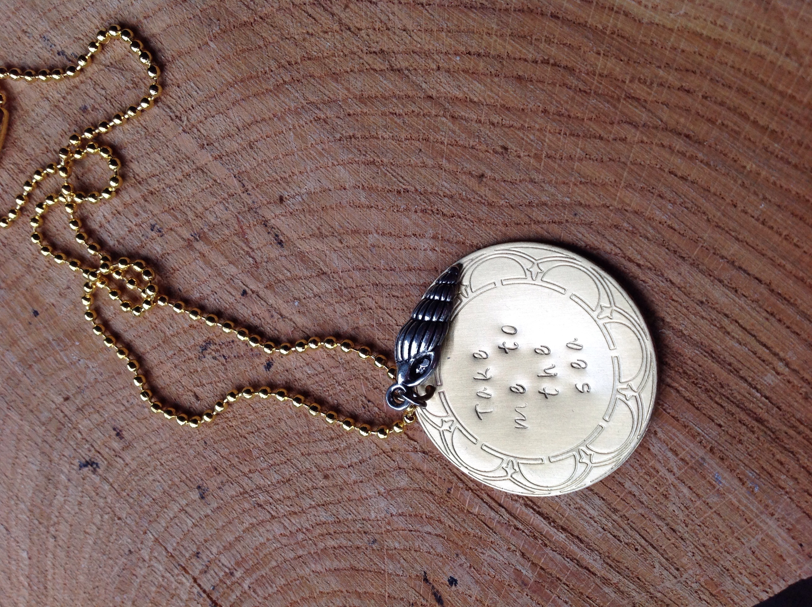 The sea inspires me. I try to get there a couple of times each year. Each time I do I am inspired by my surroundings. Hand stamped gold plated necklace with "take me to the sea". Silver tone she'll charm. Gold plated ball chain necklace 18".