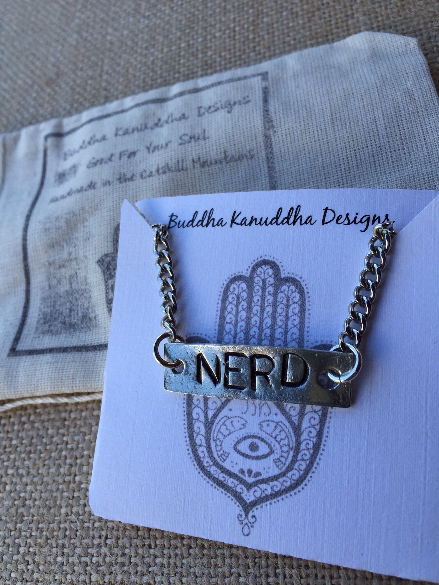 It's okay we are nerds. Nerd power ! Brains are beautiful . Hand stamped pewter tag with "NERD" on it. 16" chain lobster clasp.