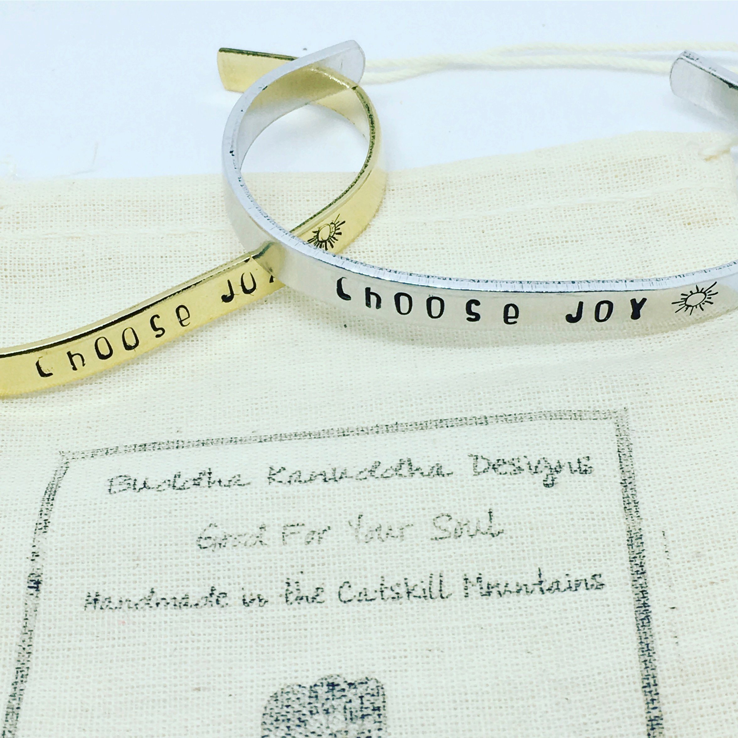 Gorgeous hand stamped bracelet with "choose Joy"and sunburst design.