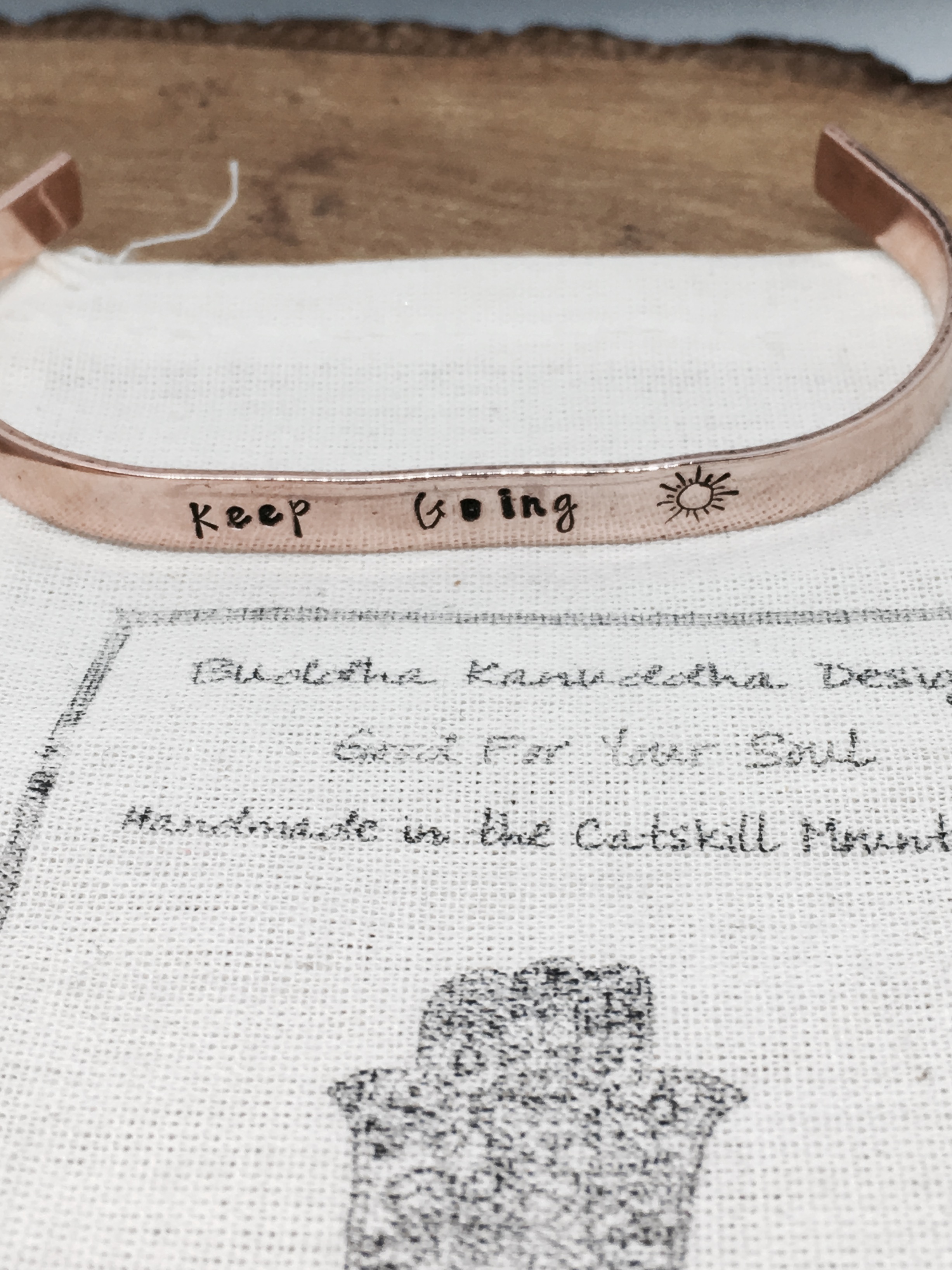 Rich genuine copper hand stamped bracelet with "keep Going " and sunburst design stamp.