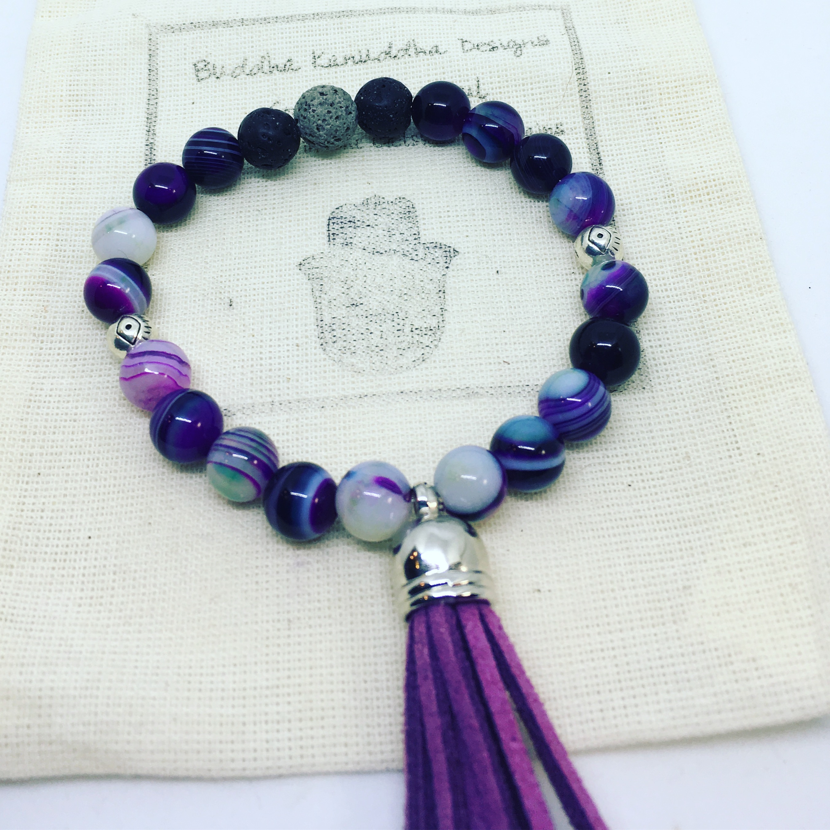 Gorgeous mermaid agate hand beaded bracelet with 3 lava Stones. Apply drop of essential oil to lava beads, whether it’s lavender to relax or eucalyptus to keep the buggies away.