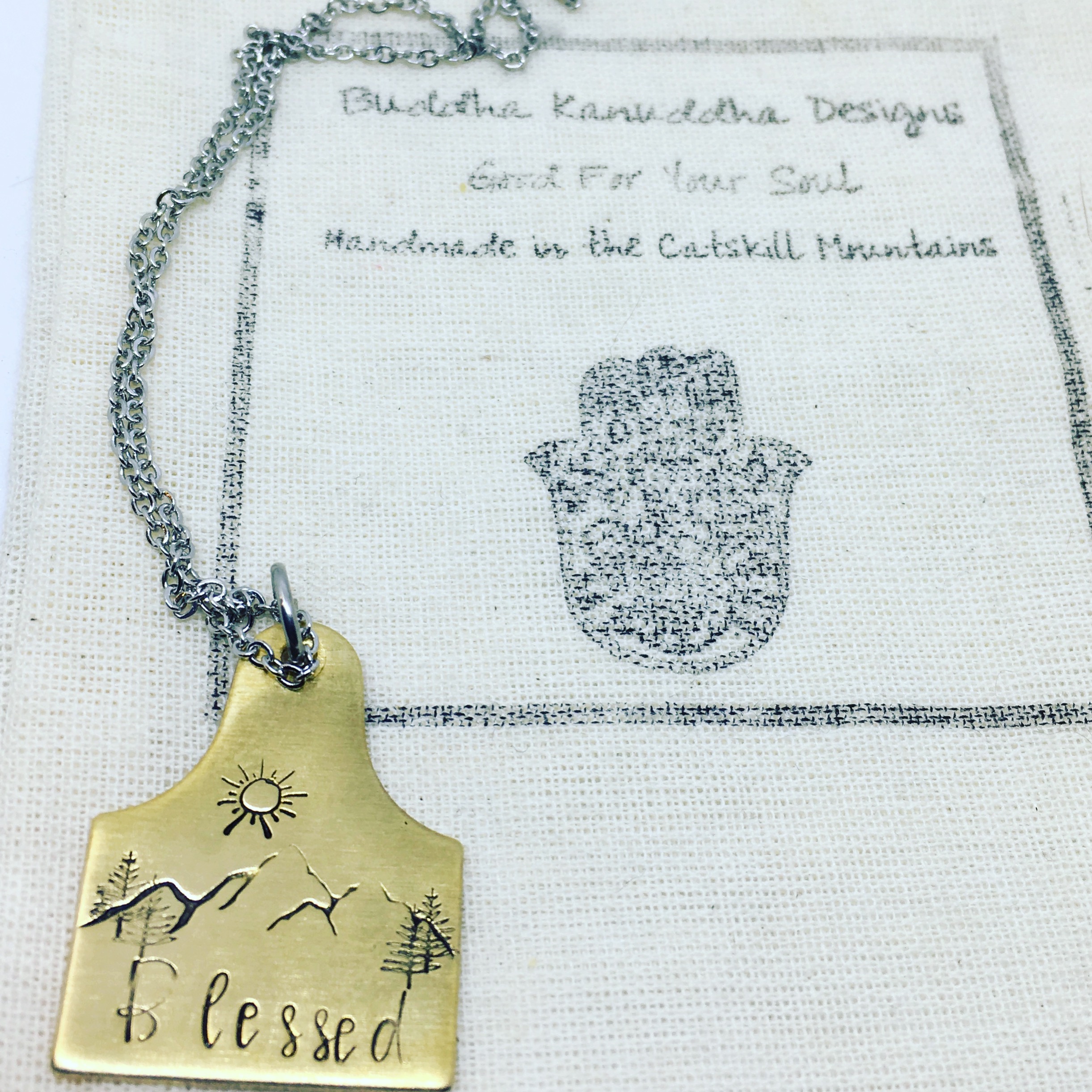 Hand stamped nugold tag with mountain scene and “blessed” on 20” stainless chain.