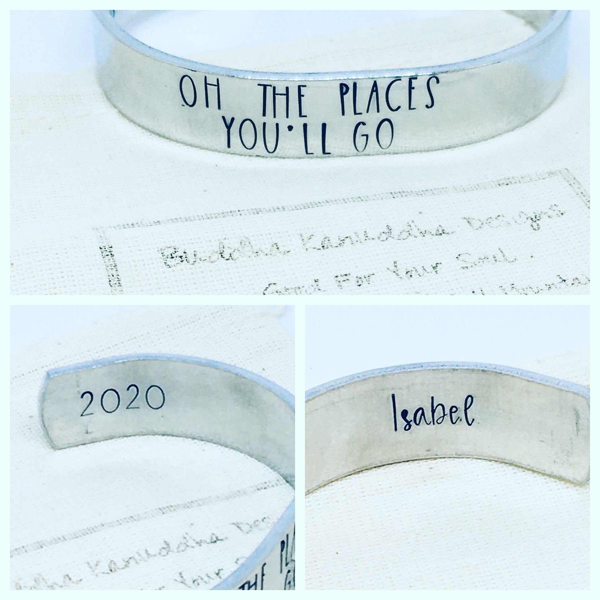 Hand stamped Bracelet with “oh the places you’ll go”. Inside personalize with name and year. ***please put personalization in notes section when ordering