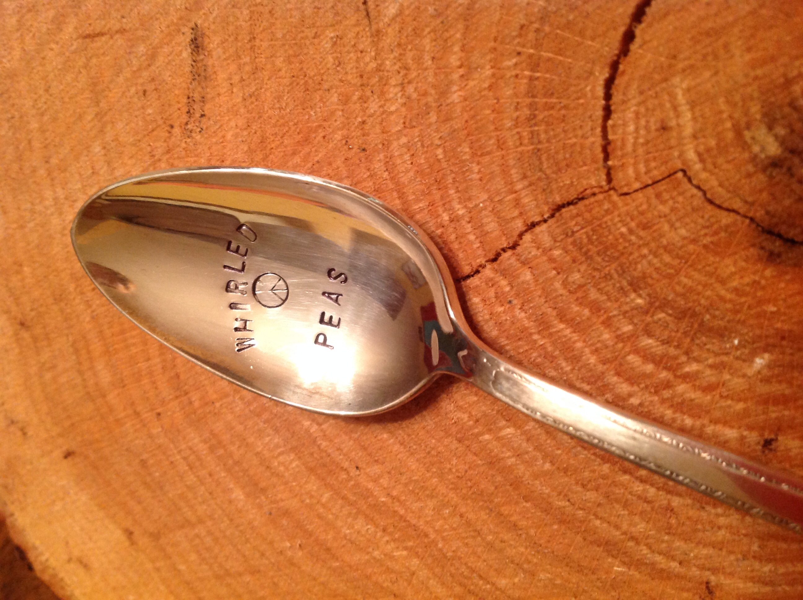Just what we all wish for! Silver plate spoon with "whirled peas" hand stamped on it. Spoon is 8" long. Perfect for stocking stuffers or hostess gifts.