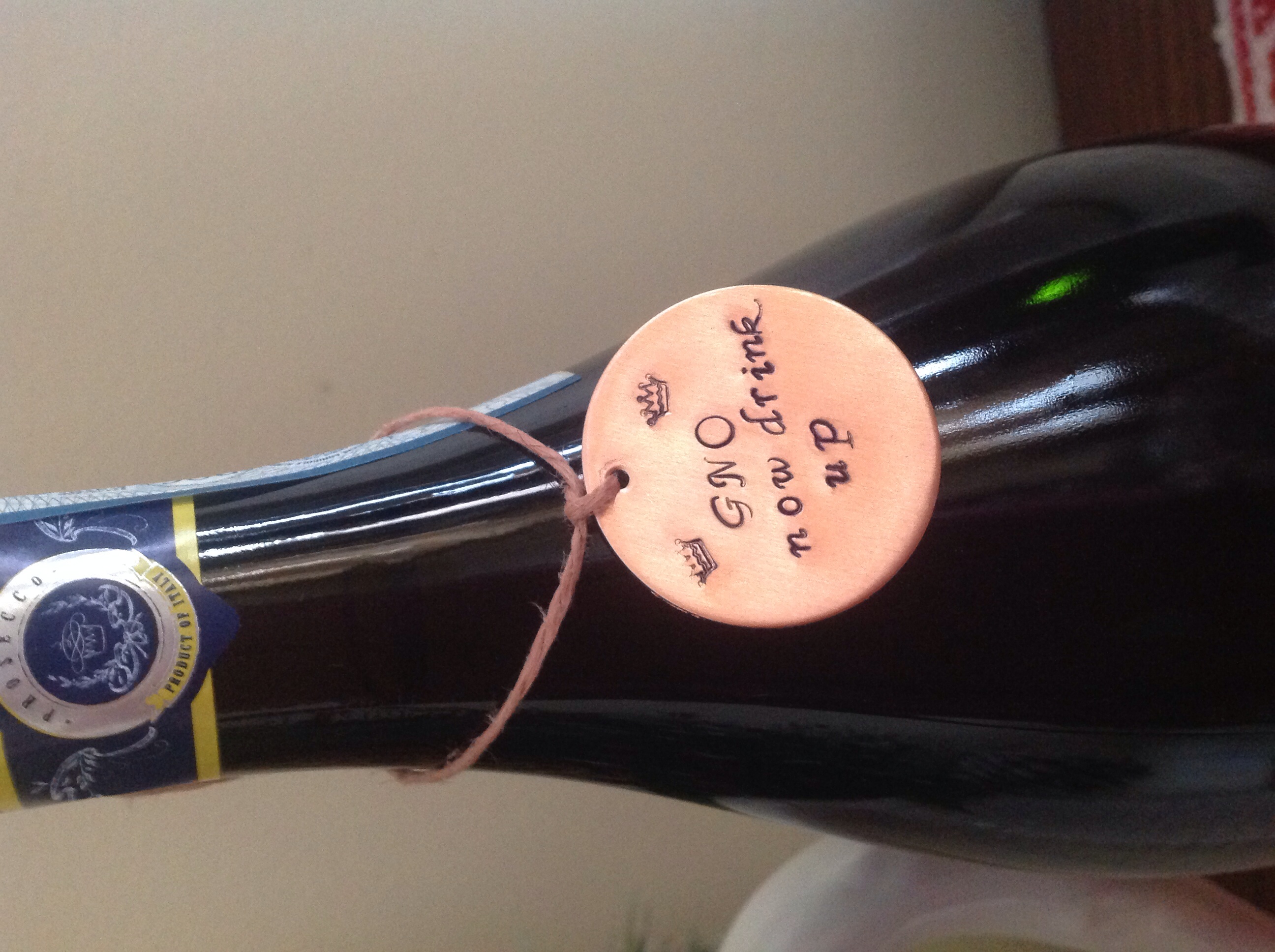 These make every bottle even more special. Why not make girls night out funny bringing a bottle with a personalized tag? Give a bottle with a personalized tag to the couple celebrating their anniversary. Each copper tag is hand stamped by myself with love.
