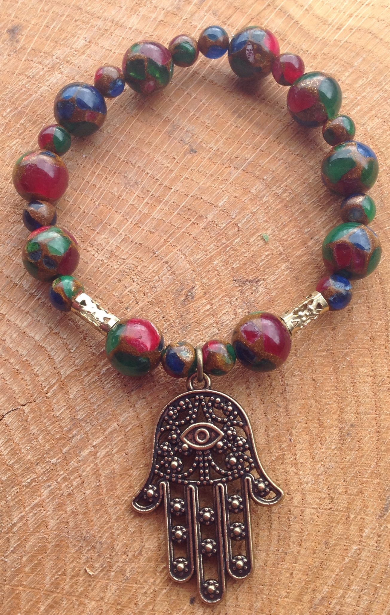 These beads are exquisite. Inlay beads with lapis, green and red jade, hand strung with Hamsa hand charm. one size. Wear alone or with others, have an arm party!